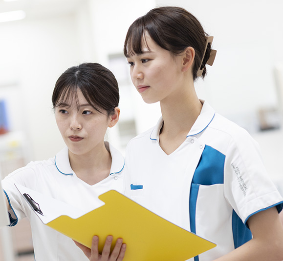 当院では入職1年目の新人看護師を「若葉ナース」と呼び、職場全体でしっかり育成する環境を整えています。入職すると最初に病院の基本的な知識習得などの研修を実施します。その後、若葉ナースプログラムに沿って、配属部署の特殊性をふまえた優先順位でOJTが進みます。その他,自己の成長を振り返るフォローアップ研修(3日/年)や、グローイングアップ研修(母校訪問)などがあります。更に、現場では「頼りになるお兄さん・お姉さん」としての先輩看護師が親身なアドバイスを行うとともに、不安などあれば臨床心理士によるカウンセリングなど、心のケアも万全です。
