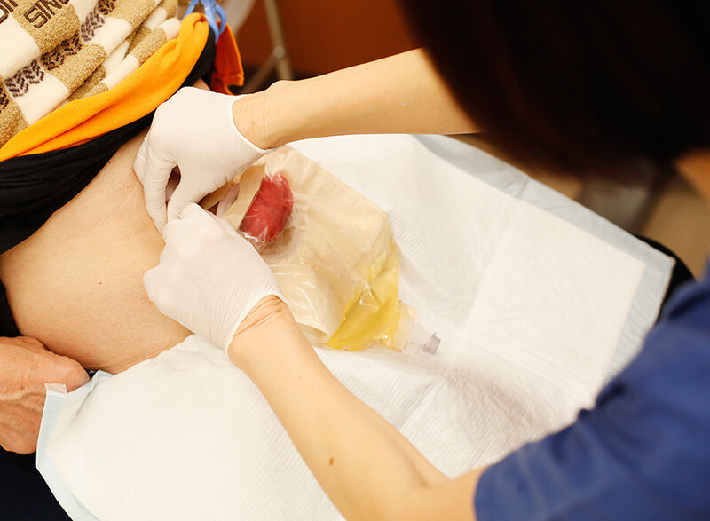 人工肛門患者さんへのパウチ装着部の皮膚ケアや個々の適切な用具選定の相談、人工肛門装着による日々の生活に対する相談など精神的なケアを行っています。指導は皮膚・排泄ケア認定看護師が中心に月3回、外来で行っています。